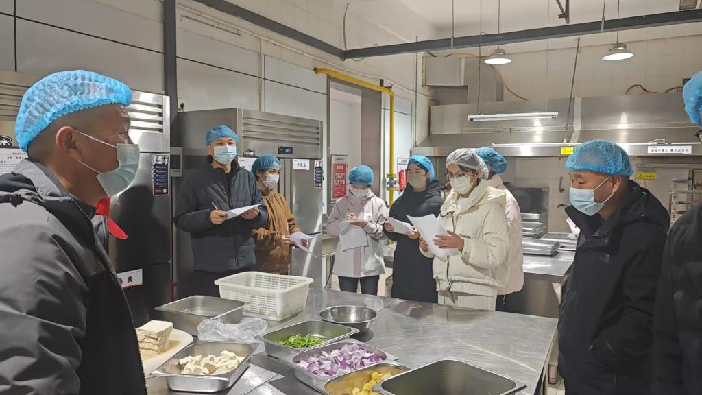 在食堂经理的带领下,检查组重点检查了食材采购渠道是否规范、储存条件是否达标、加工流程是否规范、餐具消毒是否到位、从业人员健康证是否齐全、消防设施是否齐全,并一一对检查情况做了记录。